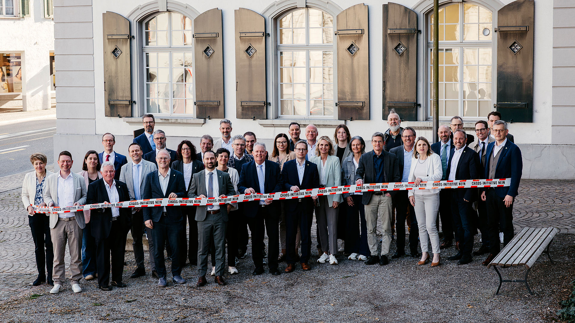 Im Bild: Sie alle sagen klar NEIN: Fraktionsmitglieder des Grossen Rats von FDP, GLP, EVP und der Mitte engagieren sich gegen die Chaos-Initiative